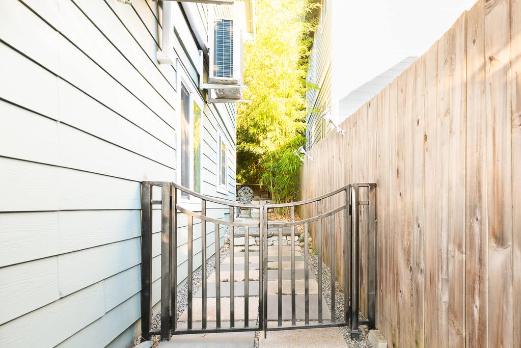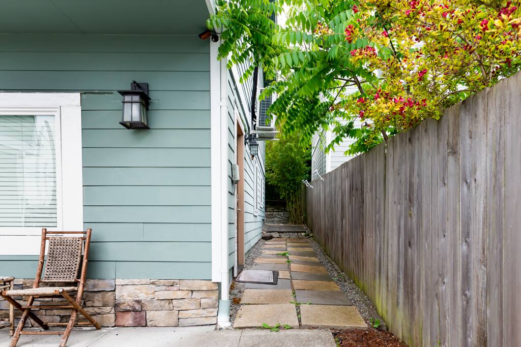 Welcome to our little slice of paradise! As you drive up to the property, you'll pass through a set of iron gates that are open year-round - because let's be real, who has time for gate maintenance when there's so much exploring to do? Once you've parked in your assigned spot, you'll find your entrance on the right side of the house, conveniently located just a few feet away. And if you're traveling with your furry friend, they'll be wagging their tail in delight at the sight of the gate that leads to your own private backyard. Now, let's talk about technology - because who doesn't love a smart lock? No need to fumble around with keys or worry about losing them on your adventures. Simply use the smart lock to enter and leave whenever you please. And when you step inside, get ready to be wowed by the 75-inch smart TV in the living room. Rainy day? Late night? No problem - you've got entertainment covered. And for those who like to whip up a meal or two while on vacation, you'll find full-sized appliances and all the kitchen essentials you need. No need to rely on takeout or fast food - unless that's your jam, of course. As for sleeping arrangements, we've got you covered there too. The queen-sized memory foam mattress in one of the bedrooms will have you snoozing in no time. And if you need to get some work done, there's a tastefully decorated desk with a mid-century chair to help you get into the zone. The smaller bedroom includes a full-sized bed, perfect for those who don't need all that extra space. And did we mention that every room has its own heat pump? No more arguing over the temperature with your travel companions - everyone can be comfortable in their own little slice of heaven. So what are you waiting for? Book now and let us show you what Pacific Northwest hospitality is all about!
